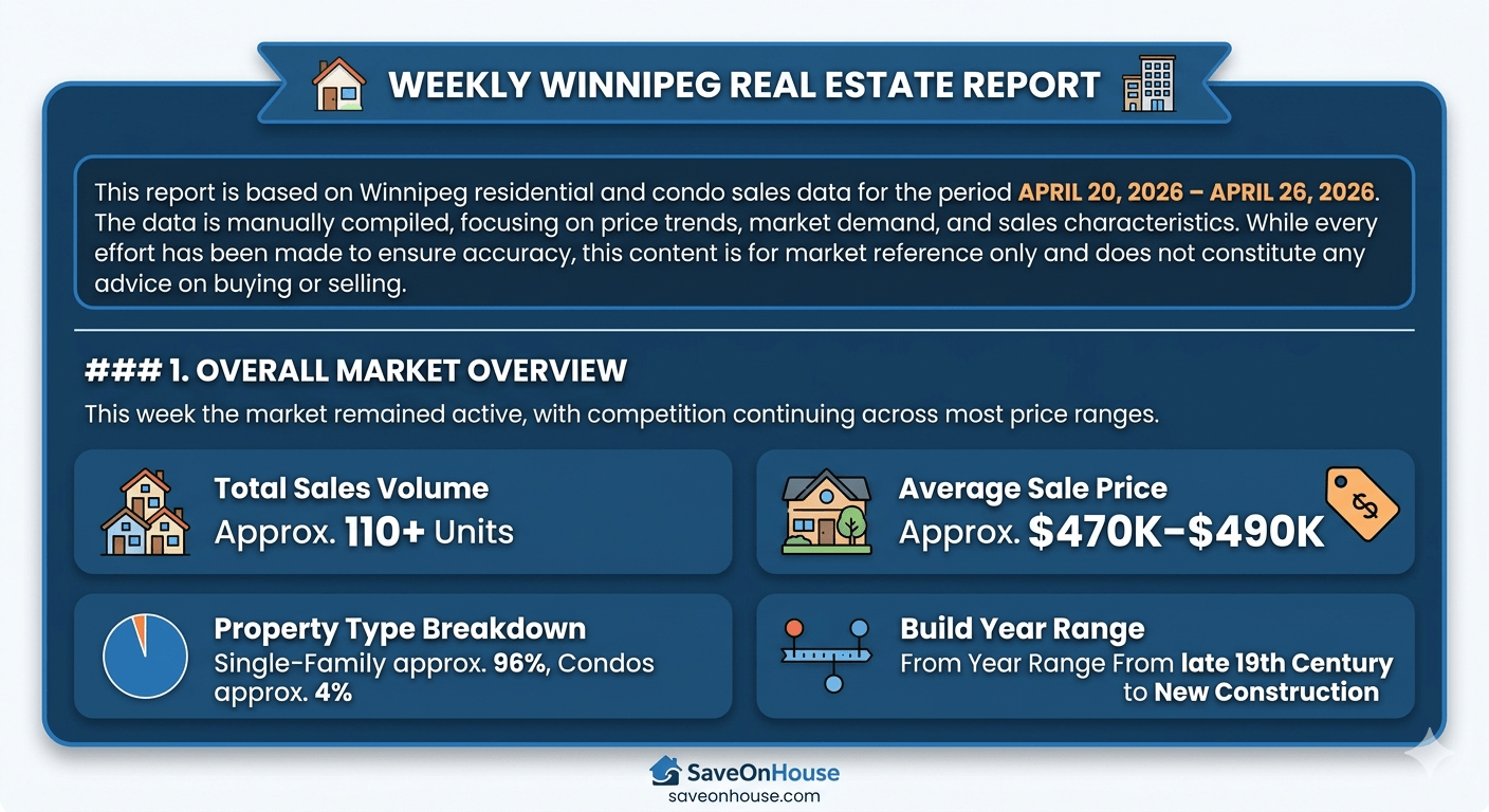 本报告基于 2026年4月20日 至 2026年4月26日 期间温尼伯住宅及公寓成交数据整理而成。数据为人工汇总,重点反映价格走势、市场需求及成交特征。尽管已尽力保证准确性,但本内容仅作为市场参考,不构成任何买卖建议。